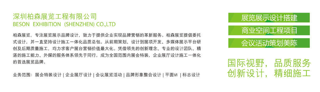 柏森展示:專注展覽展示品牌設計,提供深圳展臺搭建,深圳展臺設計,香港展臺搭建設計,是優質的深圳展覽工程公司。致力于提供企業實現品牌營銷的革新服務。柏森展示提倡委托式設計,并一直堅持展臺設計施工一體化品質總包。從前期展覽策劃、設計到展項開發、多媒體展示平臺研創及后期質量施工,均力求客戶展臺營銷價值最大化。憑借領先的創新理念、專業的設計團隊、精湛的施工能力、外媒的服務體系領先于同行,成為全國范圍內展會特裝,企業展廳設計施工一體化的首選展覽品牌公司。